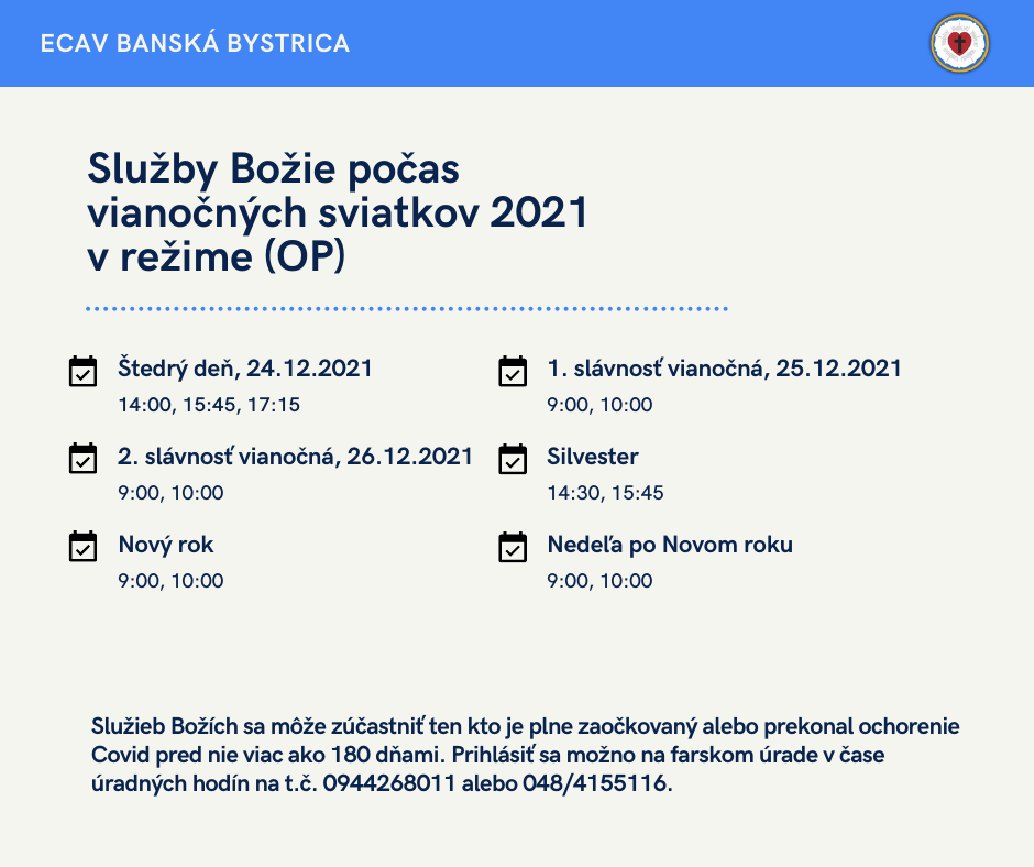 Služieb Božích sa môže zúčastniť ten kto je plne zaočkovaný alebo prekonal ochorenie Covid pred nie viac ako 180 dňami. Prihlásiť sa možno na farskom úrade v čase úradných hodín na t.č. 0944268011 alebo 048/4155116.